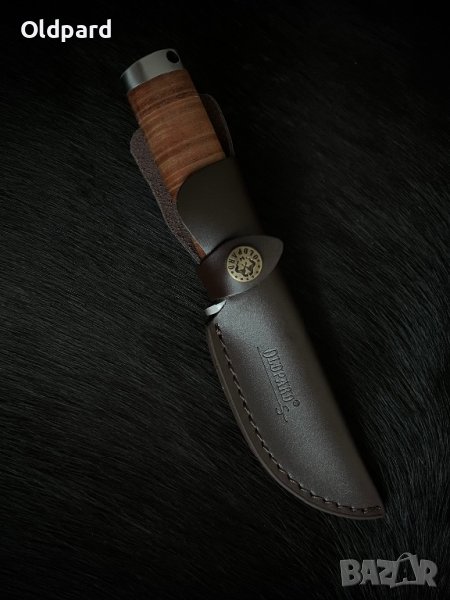 Oldpard Hunter classic - Ловен, кемпинг, outdooor нож. Острието е изработено в техниката Sun Mai с Дамаск в 67 слоя.. Централният слой е кована стомана VG10. Ергономична дръжката е кожена. Кожата на дръжката е импрегнирана със специален восък за защита от вода. Дължина на острието 10,7 см, обща дължина 21,5 см. Дебелина на острието 4,8 мм. Традиционна кожена кания. Този нож е надежден помощник във всички горски пътувания и приключения.