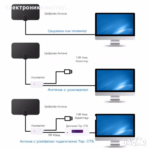 Просто разопаковайте, включете антената към телевизора и започнете да сканирате за канали. След това намерете най-добрия прием на сигнал, като местите усилващата антена на различни места в стаята и така намерите най-доброто място.