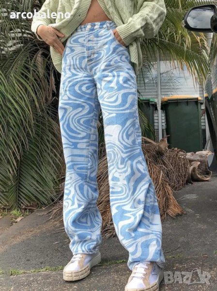 Дамски свободни прави дънки с щампа с водни вълни