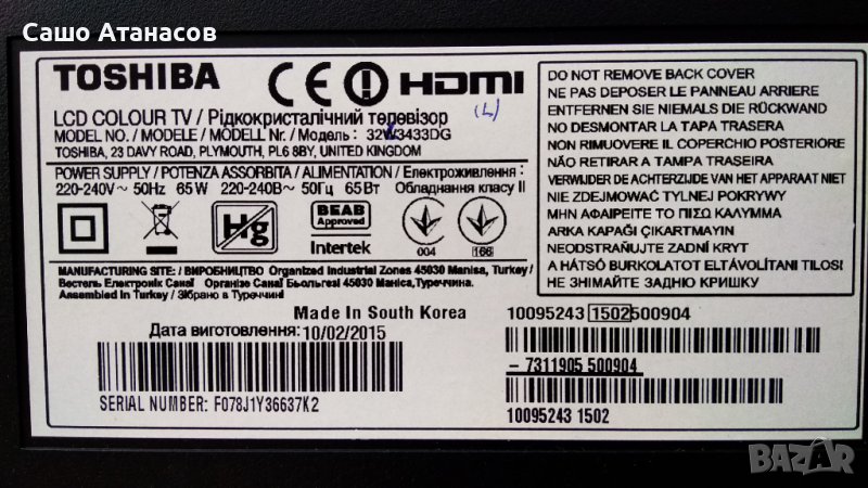 TOSHIBA 32L3433DG със счупена матрица ,17IPS11 ,17MB95S-1 ,6870C-0438A ,VES315WNDS-2D-R02 ,17WFM03