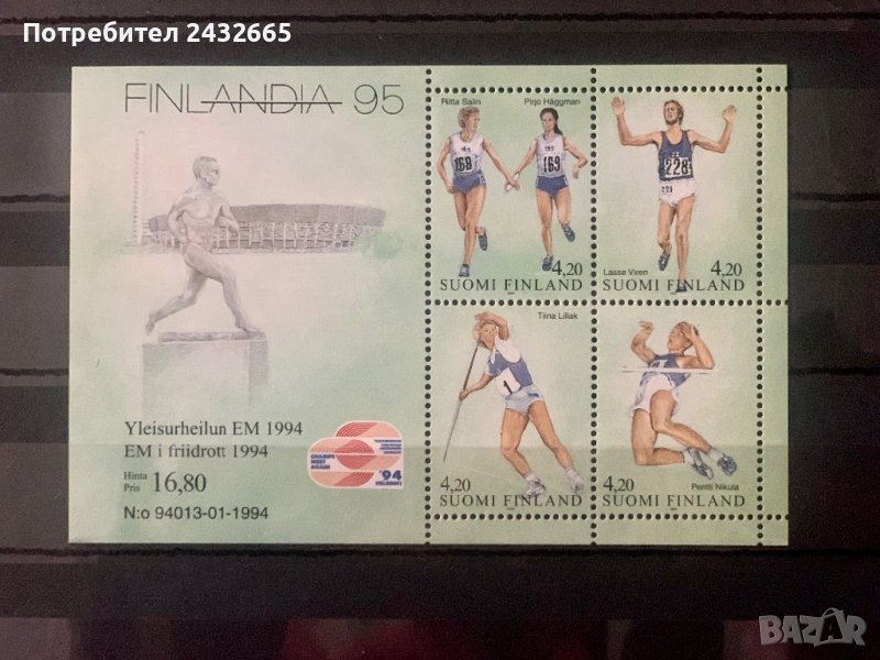 1347. Финландия1994 - “ Спорт. Лека атлетика. Филателна изложба Finlandia95 ” , MNH, ** :