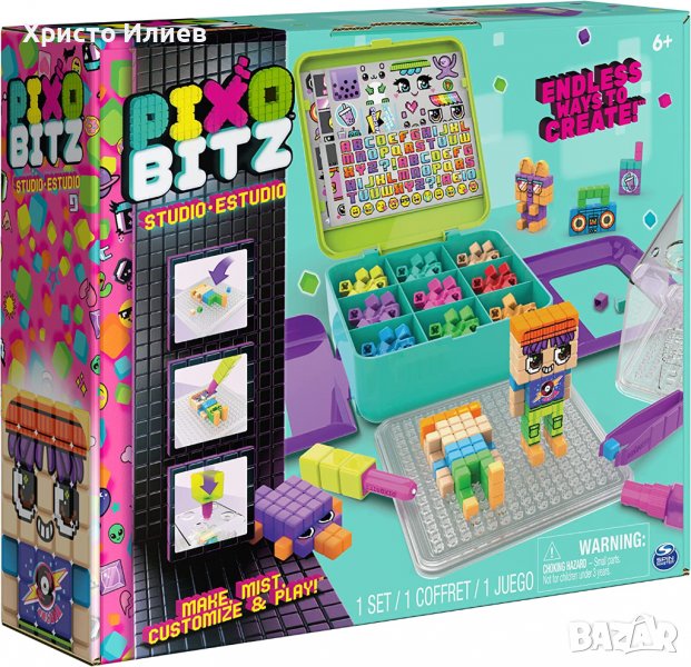 Студиото Pixobitz разполага с 500 Bitz (мъниста кубчета, които се слепват с вода) в 10 цвята, 14 аксесоара, над 100 декорации с водно прехвърляне, четири лесни за използване инструмента, две подложки и три шаблонни карти.