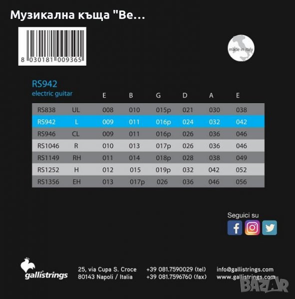 Струни за ел. китара GALLI RS-942 → Обява 39293737
