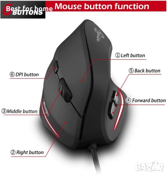 Вертикална мишка, ергономична мишка Zelotes T20, 3200 DPI 6 бутона LED оптична USB кабелна мишка за