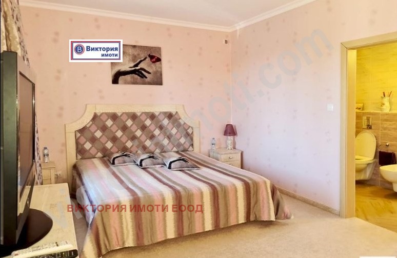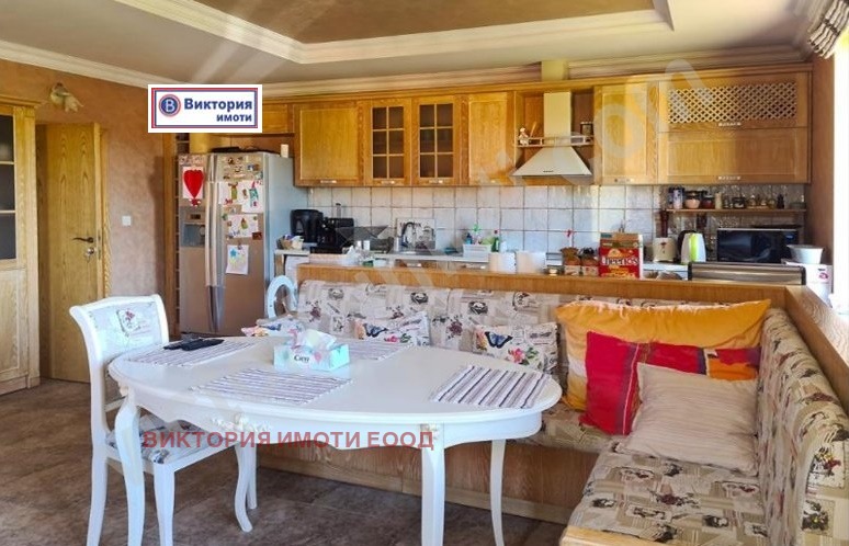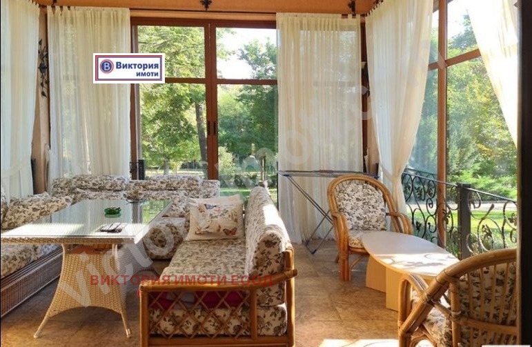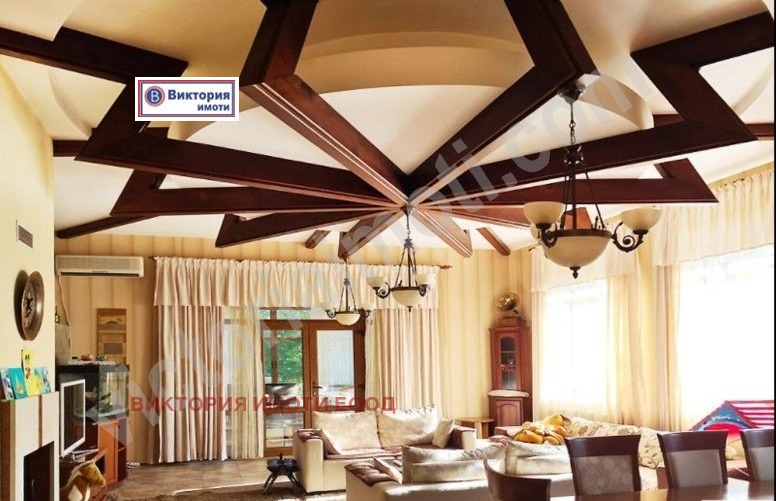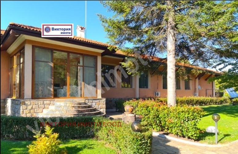 Основната къща в с площ от приблизително 470 кв.м., на които ще откриете една огромна просторна дневна, кухня с трапезария, шест спални всяка една със собствен санитарен възел, кабинет, голям коридор и остъклена веранда /зимна градина/. Къщата има два входа един основен и един през остъклената веранда. Височината на таваните също е впечатляваща близо 4 метра, което придава допълнително усещане за простор на стаите. Отоплението е решено с котел на твърдо гориво в мазата, като електрозахранването е гарантирано с резервен генератор за ток. Имотът е изцяло завършен и обзаведен с висок клас материали и мебели, всичко е съобразено цветово, а големите греди на тавана на дневната създават аристократична атмосфера.