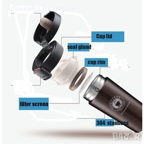 Капачката може да се премахне по желание тъй като е с винт. Между нея и чашата има специална филтрираща цедка, която няма да позволи да влезне нежелана частица в напитката Ви.