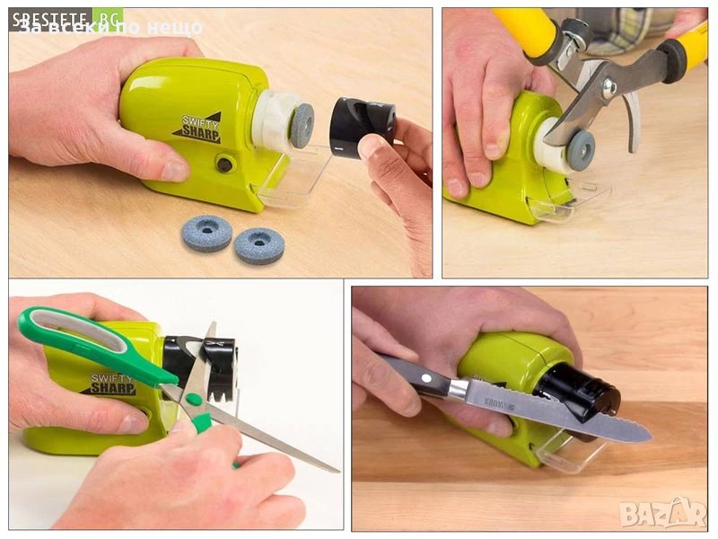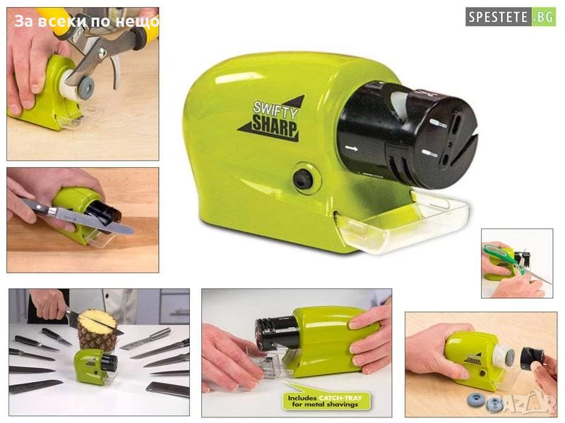 Електрическо супер точило за прави и назъбени ножове, ножици, отверки и др. остриета. Полу-професионалното точило за ножове Swifty Sharp ще заточи всички видове остриета у дома. Двустепенната система за заточване за няколко секунди превръща остриетата на обикновените ножове в остри като бръснач прибори за вашата кухня. Може да се използва за ножове, прецизни ръчни инструменти, ножици и по-големи домакински инструменти.Swifty Sharp позволява лесно да възстановяване остриетата на всички тъпи ножове вкъщи. Просто натиснете бутона за включване и поставете острието между въртящите се дискове, които имат фиксирани градуси и ъгли на заточване, едностранно или двустранно заточване според вашето желание и ръчно последващо фино заточване и полиране на острието.