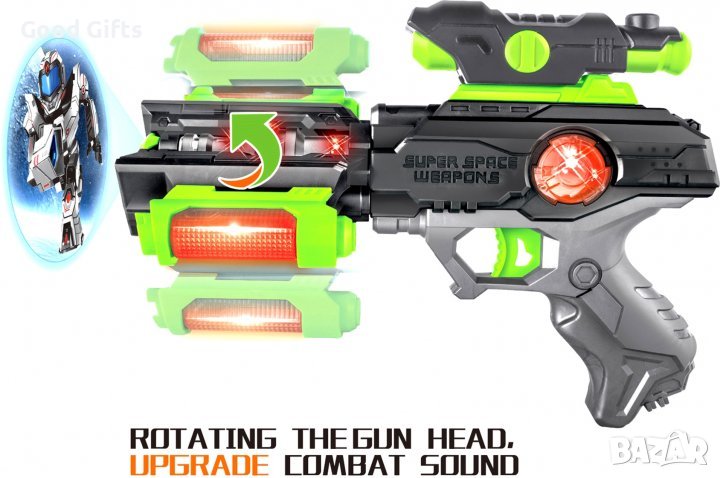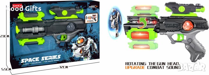 Пистолетът е с проектор, светлина и звук, което прави играта още по-вълнуваща. Оръжието проектира изображение върху повърхността в тъмното.