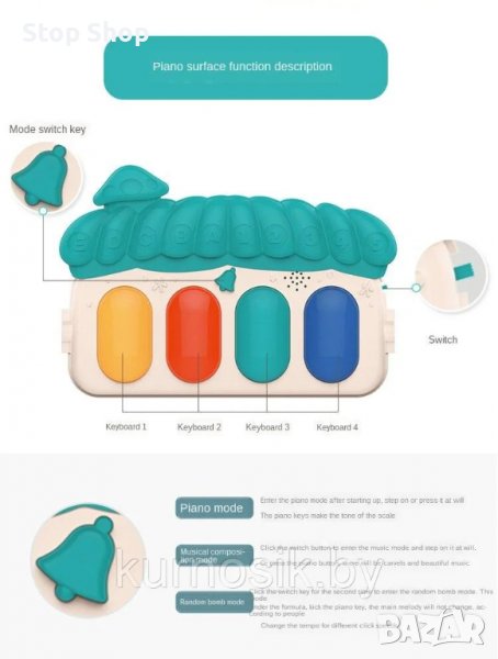 Килимчето има интерактивно пиано, което свири приятни мелодии и има светлинни ефекти.