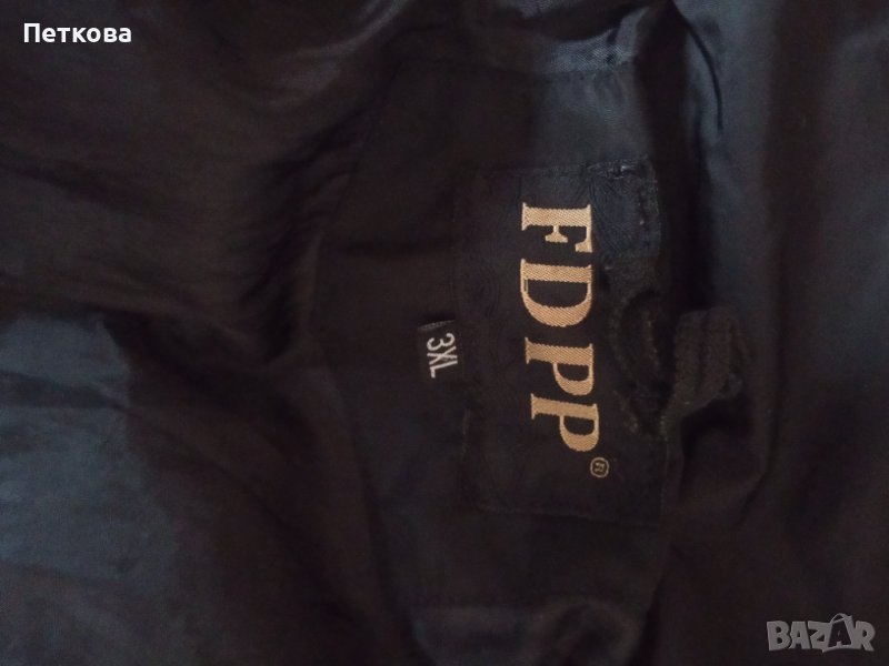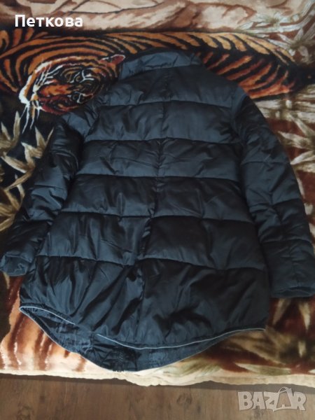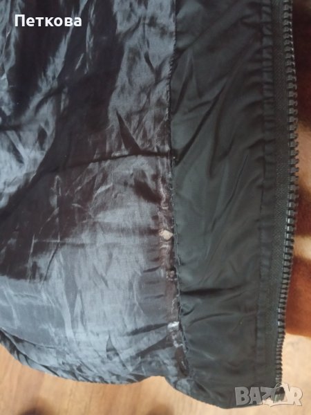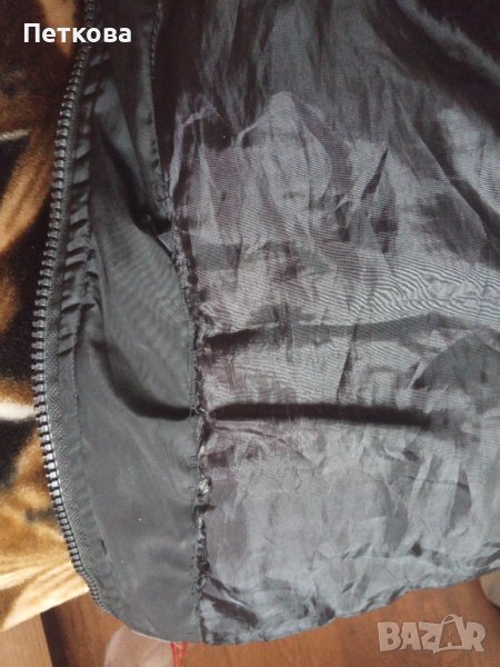 Якето е дълго, с полукачулка и удължен преден край. Закопчава се с цип, има и джобове. Умален модел, отговаря на M, L. Със следи от носене, но може още.