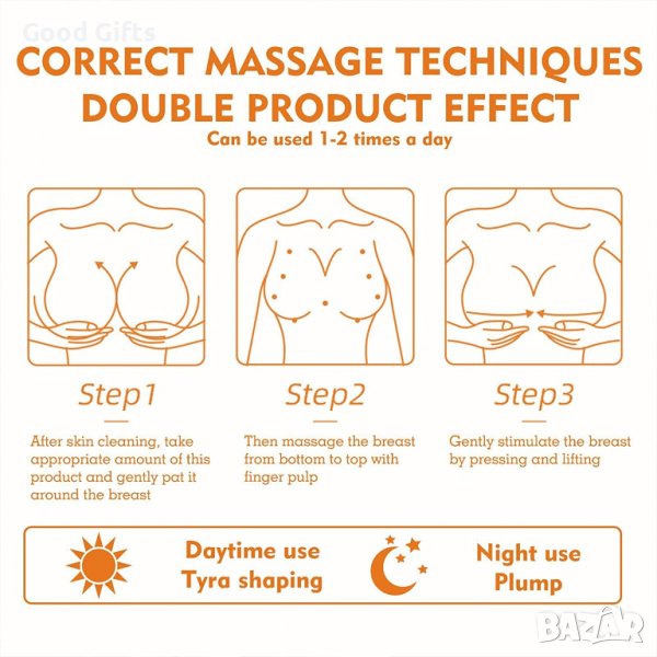 Дълбоко подхранване: Активните етерични масла осигуряват дълбоко подхранване на гръдната тъкан, подобряват еластичността на кожата, възстановяват изправеността и създават плътни и привлекателни гърди.