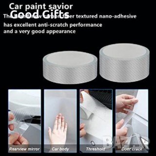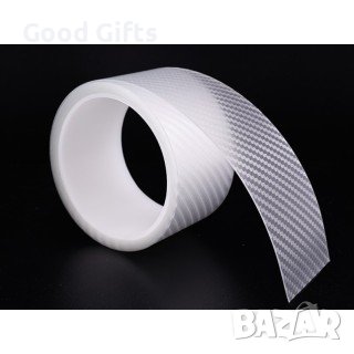 Прозрачна карбонова лента за кола - карбон със структура, имитираща 5D. Подходяща е за защита на повърхности като праговете на автомобила, броня под капака на багажника, ръбове на врати, огледала на автомобили и др. Лентата е самозалепваща се и има два слоя (с допълнително залепващо защитно фолио). Устойчива е на атмосферни условия, така че може да се използва на открито.