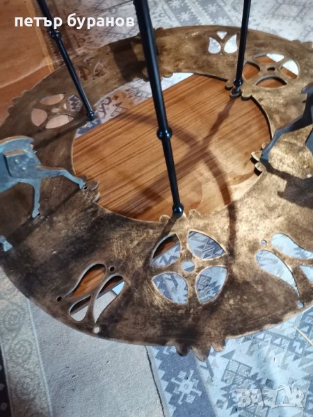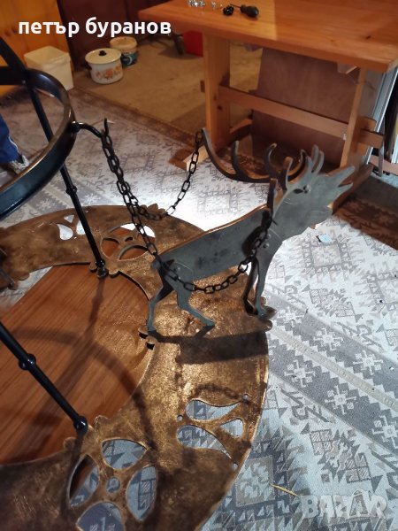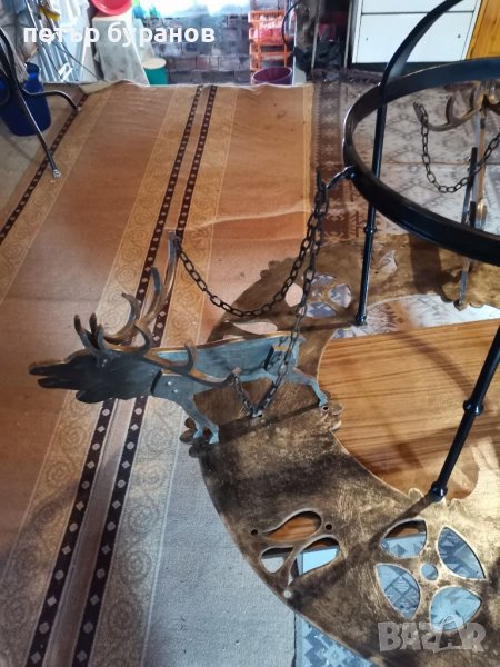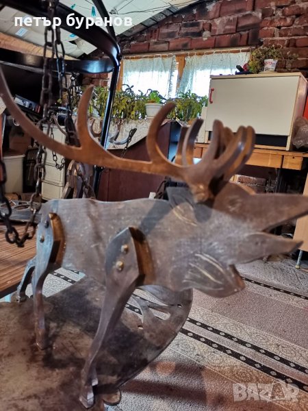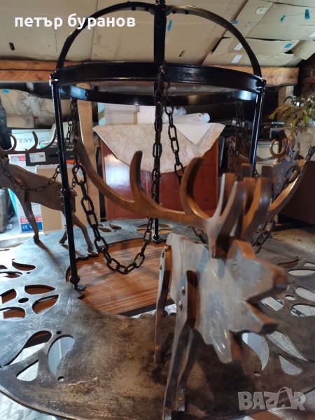 Старинен метален полюлей масивен.Представляващ три благородни елена държащи корона. Подходящ за вили или ловни хижи.