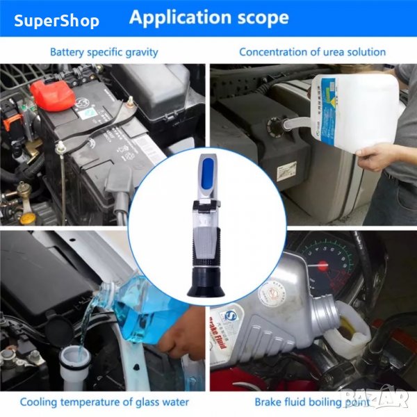 Оптичен рефрактомер(тестер) за измерване на замръзване на антифриз, течноста за чистачки и състоянието на електролита на акумулатора. За измерване на антифриза са направени две скaли, според производствената характеристика – Етилен гликол или Пропилен гликол. Отделно разполага с скaла за измерване течността на чистачките и нейната температура на замръзване. Уредът е с много висока надеждност и лабораторна точност.