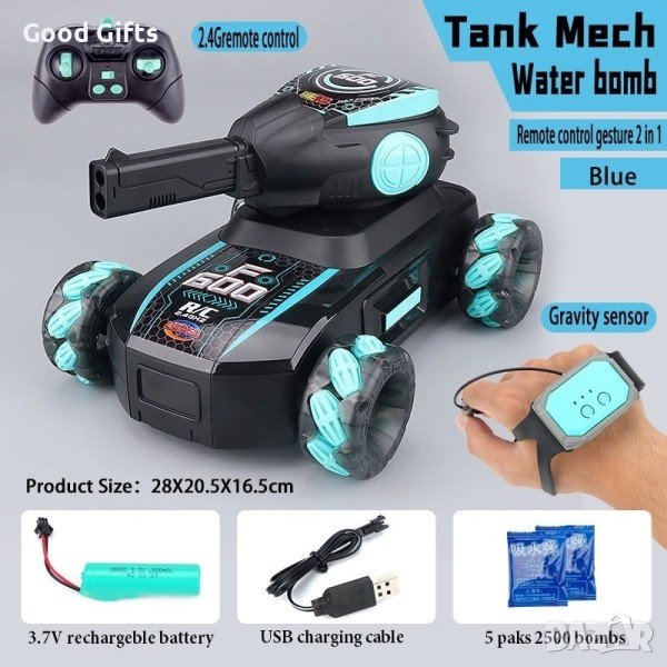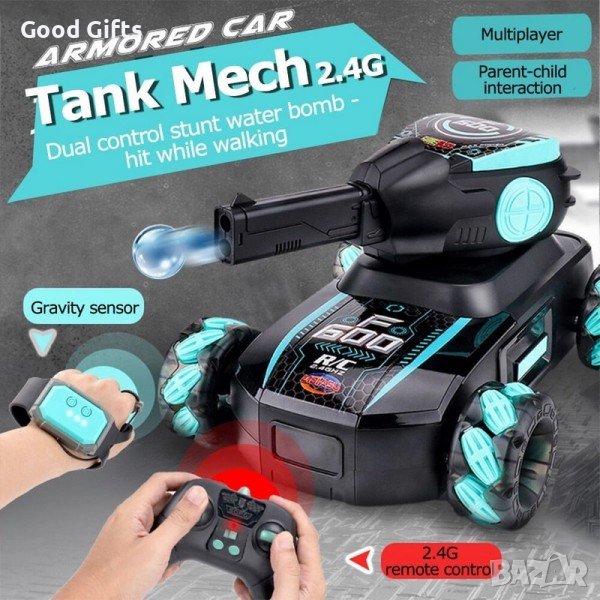 Този TANK MECH се управлява с дистанционно, изстрелва водни бомби, свети в различни цветове и изнава звуци. За контрола над танка може да използвате едно от двете дистанционни в комплекта, стандартен джойстик или сензорно дистанционно за ръката. Той може не само да изстрелва водни бомби дистанционно, но и да извършва многопосочно шофиране и каскадьорски изпълнения.