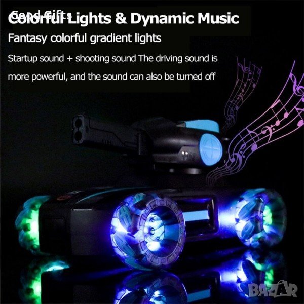 Предлага разнообразие от режими на шофиране, интелигентна система за управление и гениални гуми на танка му позволяват да се движи, като хоризонтално, наляво и надясно, така и въртене на място на 360 градуса и т.н. Готините светлини и динамичната музика го правят още по-атрактивен. При изстрелване на водна бомба, танка използва светлинен ефект, за да направи играта още по-вълнуваща през нощта. Дистанционните управления на 2.4G поддържат игра от няколко танка в група, без командите да пречат на другите играчи. Идеален за игра с приятели.
