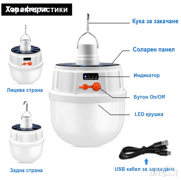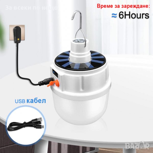 Къмпинг лампа с кука за закачане и 5 режима на светене. Мощна и удобна акумулаторна къмпинг LED лампа за закачане с вградени батерии и соларно зареждане през деня и USB кабел нощно време. Идеална е за къмпинг, за градина или ремонтни дейности.