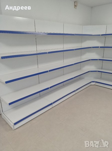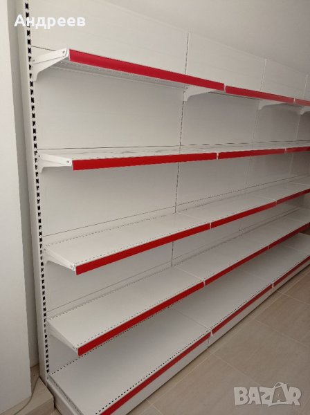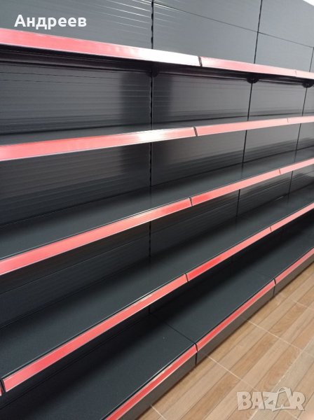 Крайстенни стелажи с основен рафт /долен/ 40см, четири рафта по 40см /с вкл. рафтоносачи/, плътни гърбове, ценови ленти (прозрачни с бял гръб), колона с пета и декоративно чело - долно.