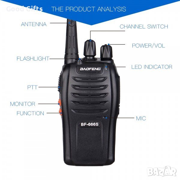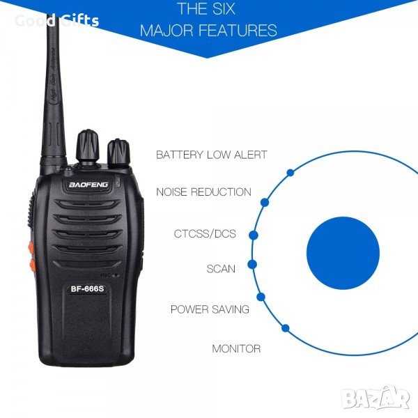 Удобна и надежна портативна радиостанция BaoFeng BF-666S подходяща за активни дейности на открито, туризъм, офроуд, в закрити помещения на индустрията, промишлеността и търговията. Практичен дизайн, универслно приложение, компактна и лесна за употреба - каналите се превключват посредством бутон, разположен до антената отстрани. Радиостанция BaoFeng BF-666S работи само на една честота /UHF/ 400-470MHZ, като обхватът на разговорите се простира до 5 км, според релефа. Тя предоставя възможност още за свързане до 16 канала и има LED фенерче, VOX функция, функция за пестене на енергия, подтискане на шума. Радиостанция BaoFeng BF-666S се захранва с Li-ion батерия с капацитет 3800mAh (3.7 V), като в комплекта са включени още зарядно устройство, антена, щипка за колан, слушалка и упътване. Радиостанция BaoFeng BF-666S може да работи в температурен диапазон от -20 до +60 градуса.