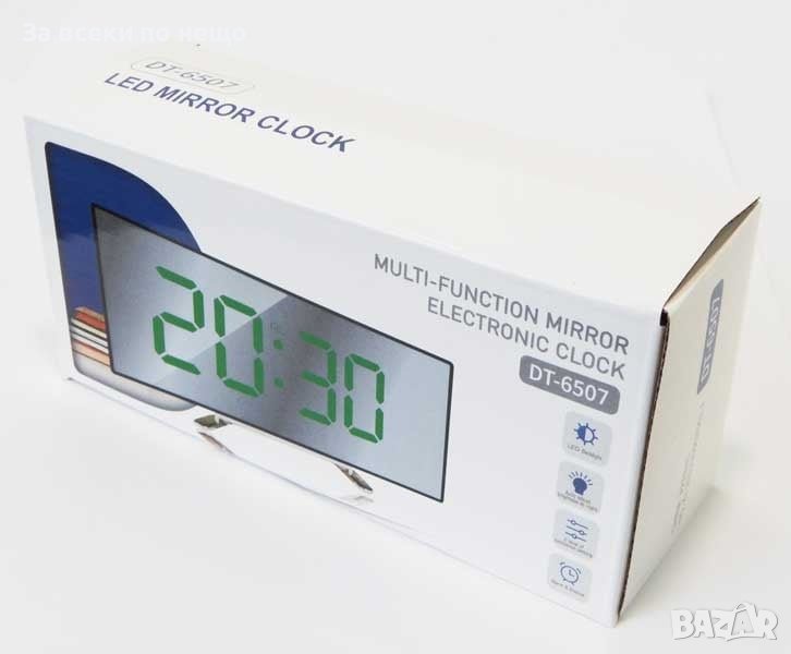електронен часовник DT-6507 с огедален дисплей с зелени светодиодни индикатори, календар, аларма. Показва текущо време, дата, месец и температура. Размери 170x72x28mm. Захранване с 3бр. батерии 1.5V R03 AAA или от USB порт 5VDC. В режим захранване само на батерии, дисплеят се изключва автоматично след 16 секунди. В комплект с USB кабел.