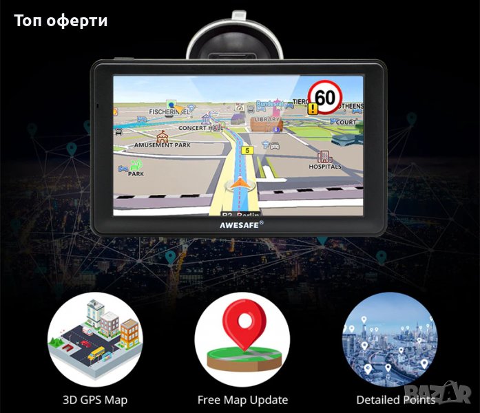 Устройството пристига с ярък 7.0" дисплей с подробни карти. С безплатни доживотни актуализации на картите вашите маршрути със сигурност ще отразяват най-актуалните карти, POI (интересни точки) и информация за навигация.