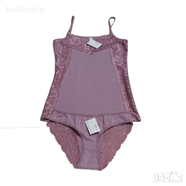 Дамски дизайнерски комплект в цвят Пепел. Състои се от две части - корсаж с тънка презрамка, леко втален и богато декориран с мека еластична дантела с флорален мотив в горната и страничната част. Бикините са със стандартна талия, украсени с дантела. Комплектът е изработен от нежна памучна материя, която придава пълен комфорт на тялото.