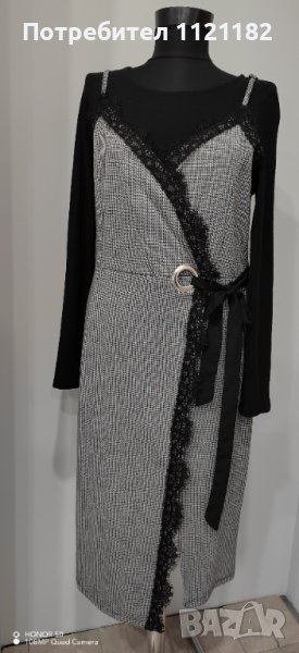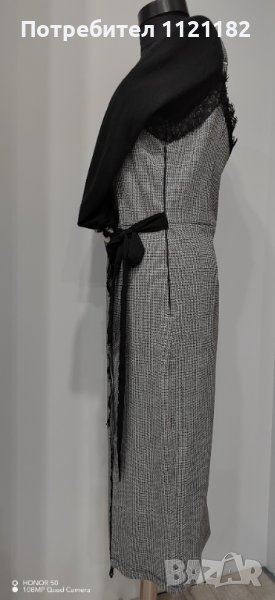 Дамска рокля с черна блуза с дълъг ръкав пришита към горната част на роклята.Има скрит цип отстрани и цепка отпред.Размера е S-M.Роклята е мерена само. Не е носена.