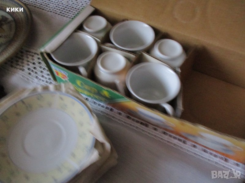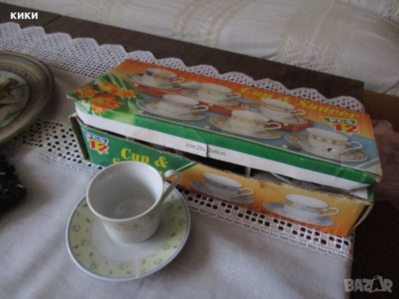 Нов .Сервиз за кафе Порцелан. Чашки бели със синьо и жълто - 12 части- 15 лв