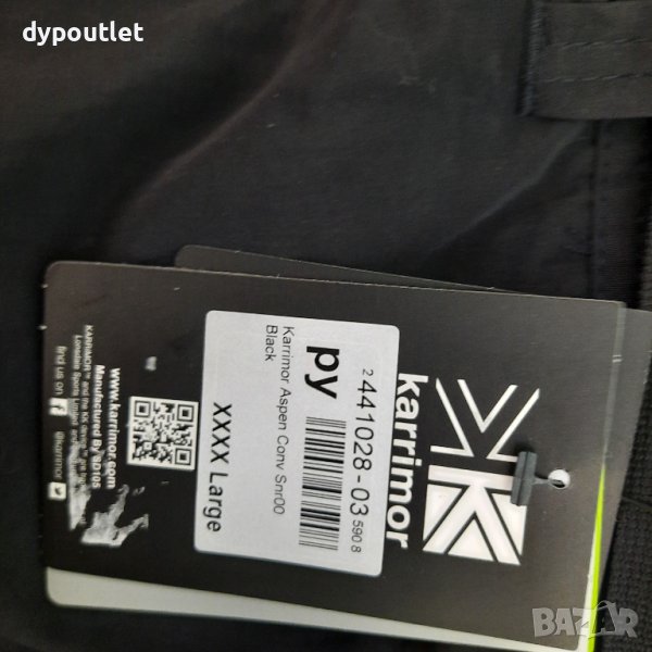 Karrimor Aspen Convertible- Мъжки туристически панталон дълъг/къс, размер - XXXXL. Цвят - матово черно. Мъжки туристически панталон, две в едно, подходящ за туристически-планиниски походи. Разполага с колан за регулиране, с 2 отворени и 4 затворени джоба. Ширина горна част - 56 см., дължина 112 см..