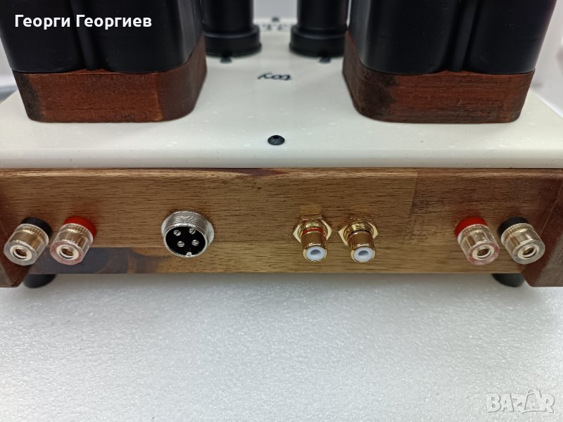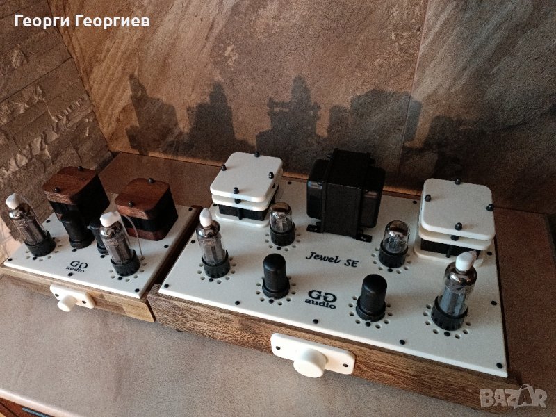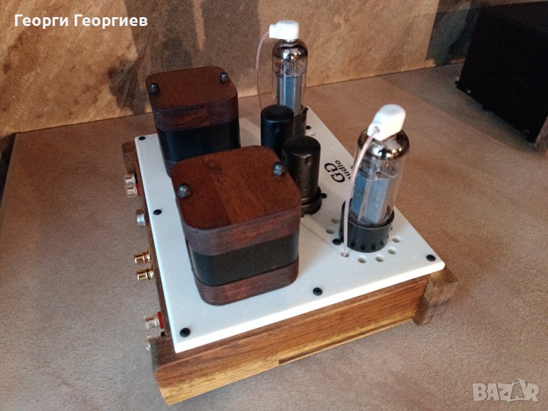 Използвани резистори на MULTICOMP и TESLA. Окабеляване по сигнал – сребърен многожилен проводник с тефлонова изолация, по захранване – OFC италиански меден проводник. Изходни трансформатори на Quad C-core с подобаващо секциониране, изчислени и изработени от мен (усилвателят е подходящ както за 4-, така и за 8-омови озвучителни тела). Корпус от дърво опушена акация, шаси и елементи по корпуса от технически камък. За цифроманите: изходна мощност – 5,5W/канал, честотна лента - 13Hz-50kHz, входна чувствителност 1V, входен импреданс 100kOhm. Размери усилвател: 235х210х160мм, на захранващия блок: 200х180х120мм. На последните три снимки е поставен до Jewel SE, просто за сравнение на размерите.