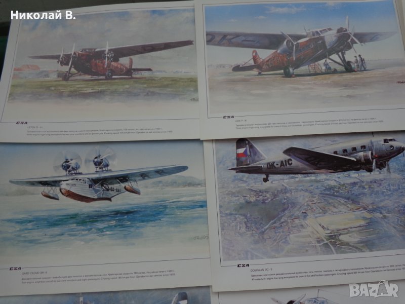 Продавам 33 броя рисунки ( рисувани от Vladimir Bidlo 1979 Printed By Severografia Decin ) на самолетите които са били на служба в CSA от 1928-1967 год. Размерите на всяка картина са: дължина 35.5 см, височина 25 см.