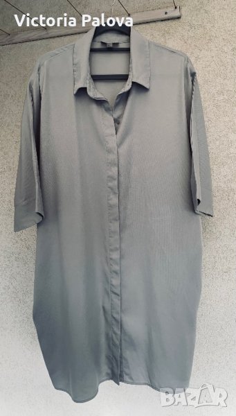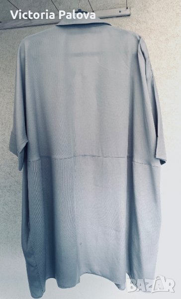 Рядко красив цвят-сиво-син,тежка материя,пада красиво,кройката е също необикновена-на гърба е по-широко,но не с плохи,а благодарение на кройка-дъга.без шев по ръкави,ГО-70см,дължина-95см,скрити копчета,два странични джоба.туниката(роклята)е с посочен М размер,но ще бъде ок и за L,и за XL.