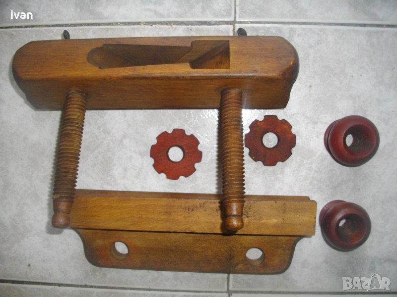 Голямо, масивно, старо старинно/антикварно ръчно дърводелско ренде без нож - предполагам от времето на ранен Соц. Рендето е тип профилно, с дървени винтове, дървени врътки за регулация и настройки за дълбочина, масивни стяги към него за дълбочина на профила при стружуване.