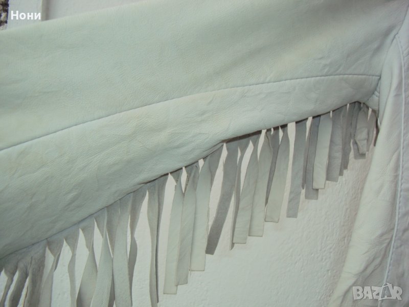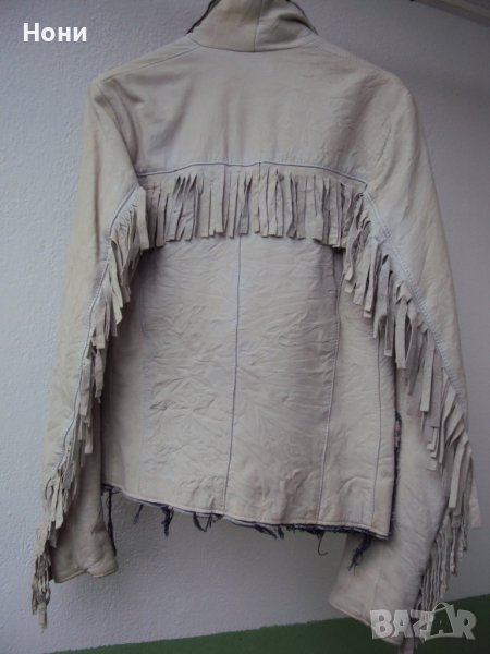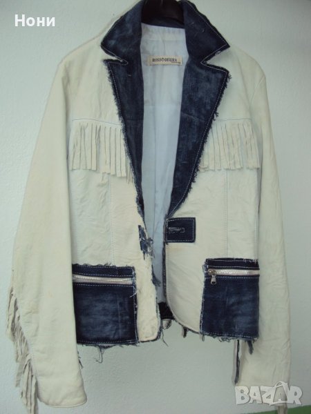 Кожено яке в комбинация с дънкови ревери. Якето е купено от Италия. Ръст С. Обличано до пъти. Кожата е естествена и намачкана на ефекти. Има дънкови ревери и дънкови джобове. Забележката е съвсем малка. На десният ръкав има леко петънце цвят екрю във вид на малка точица!. На последната снимка съм показала тази точица! Но като се облече якето не се забелязва. На мен ми е малко и затова го продавам, дължина на якето 54 см. Дължина на ръкава 62 см. От рамо до рамо 40 см. От подмишница до подмишница 44 см., има кожени ресни, на които дрес- кода е каубойски мотив. Якето има и подплата!