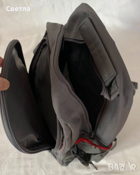 Капакът на чантата е водоустойчив, има и покривало за дъжд.