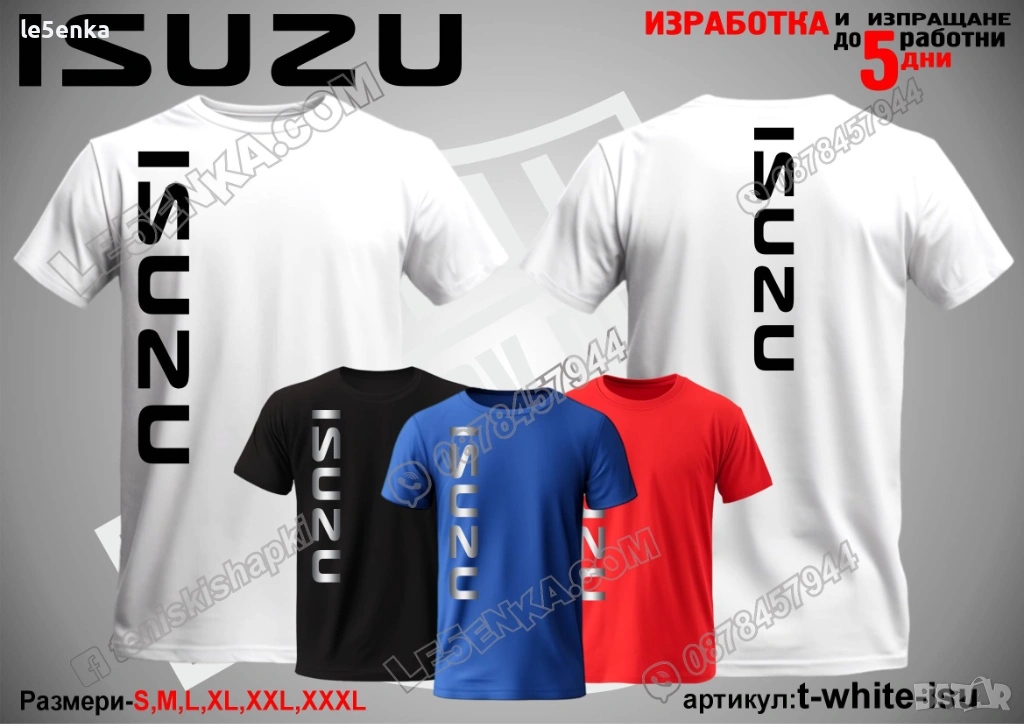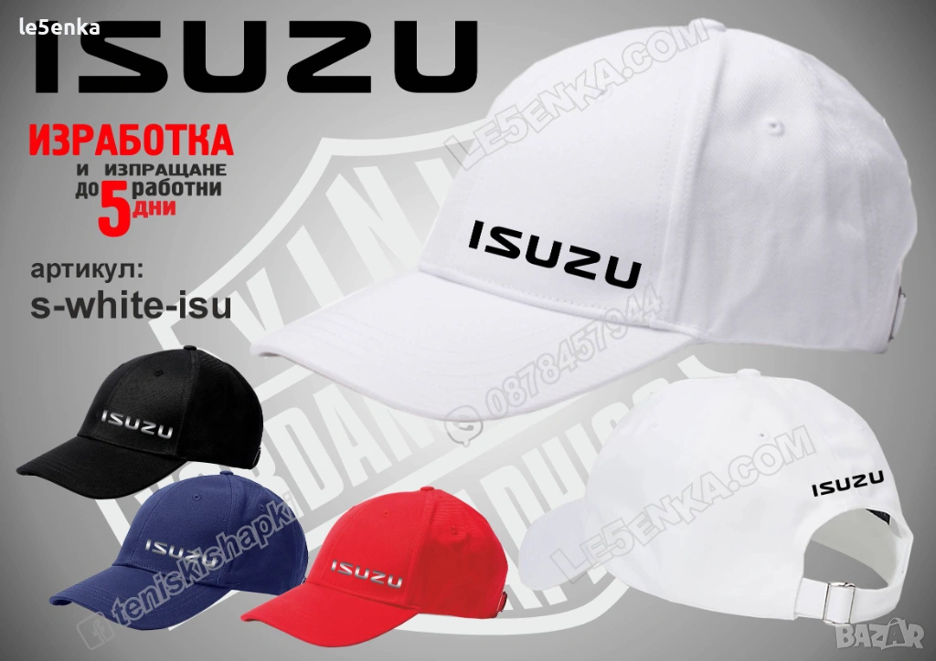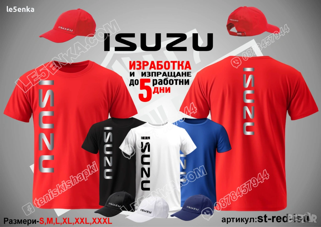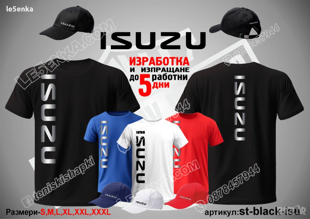 Посочената цена е за шапка и тениска комплект. Само шапка - 18 лв. ,а само тениска - 32 лв. Тениските са изработени от качествена памучна материя - различна номерация и цветове - черен, син, червен и бял. Шапките са памучни с метален клипс или коланче за регулиране - тип бейсболни. Последната снимка в обявата е на таблица с размери за тениските.