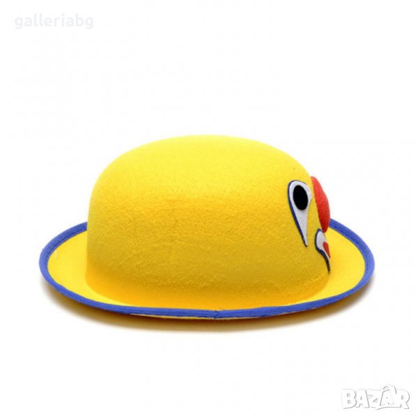 Парти шапка - карнавална шапка в жълт цвят с очи и нос на палячо. Шапката е леко издължена, във формата на бомбе с тънък син кант по края.