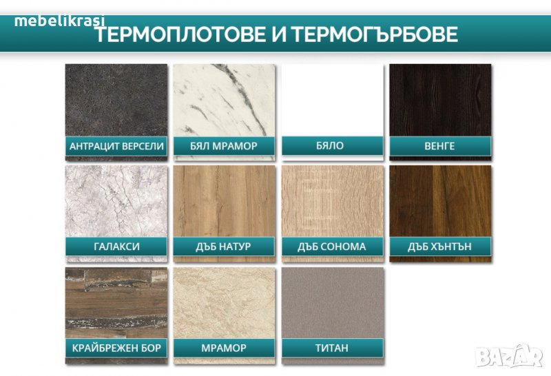 Дъб хънтън/ Бяло/ Венге/ Мрамор/Дъб сонома/ Титан/ Галакси / Дъб натур/ Антрацит версели / Бял мрамор / Крайбрежен бор
