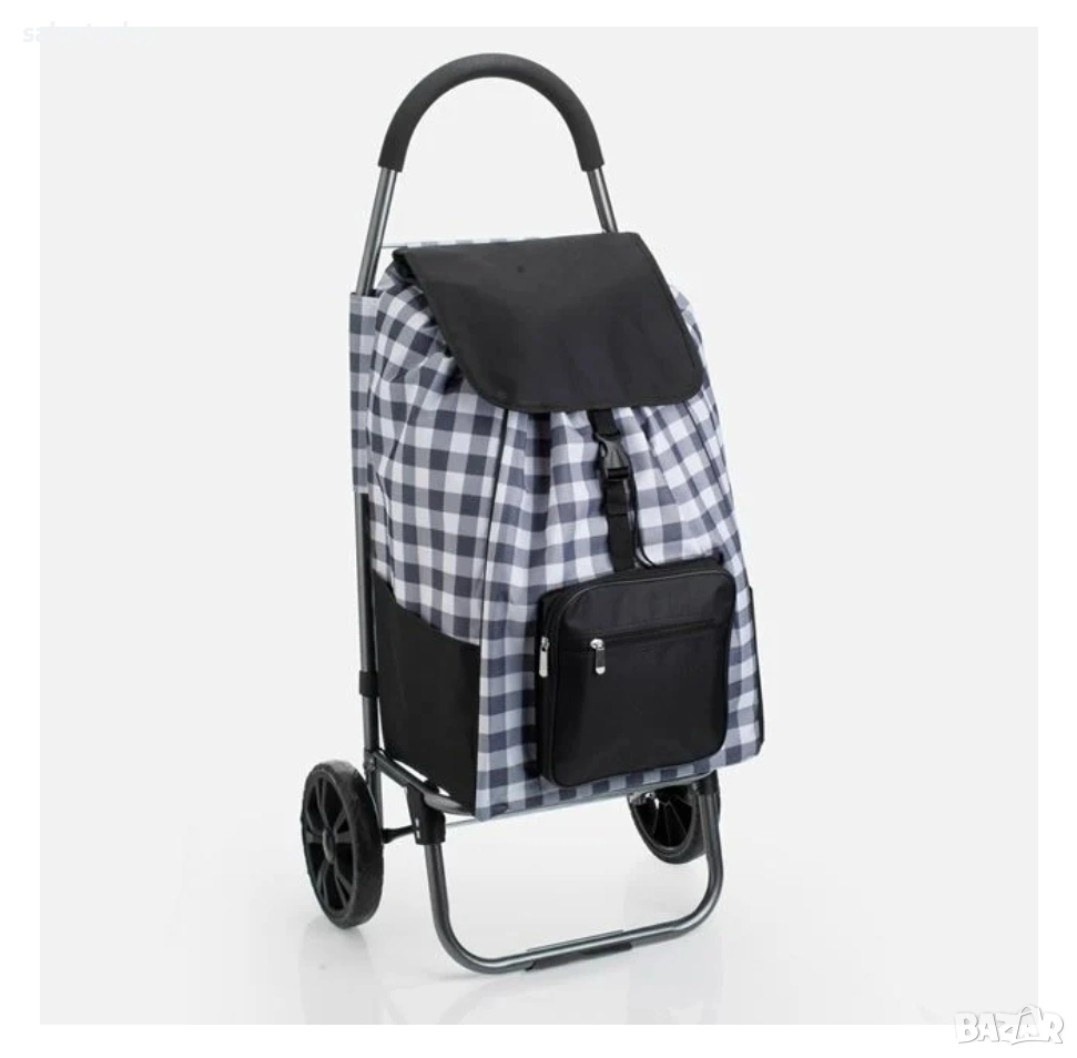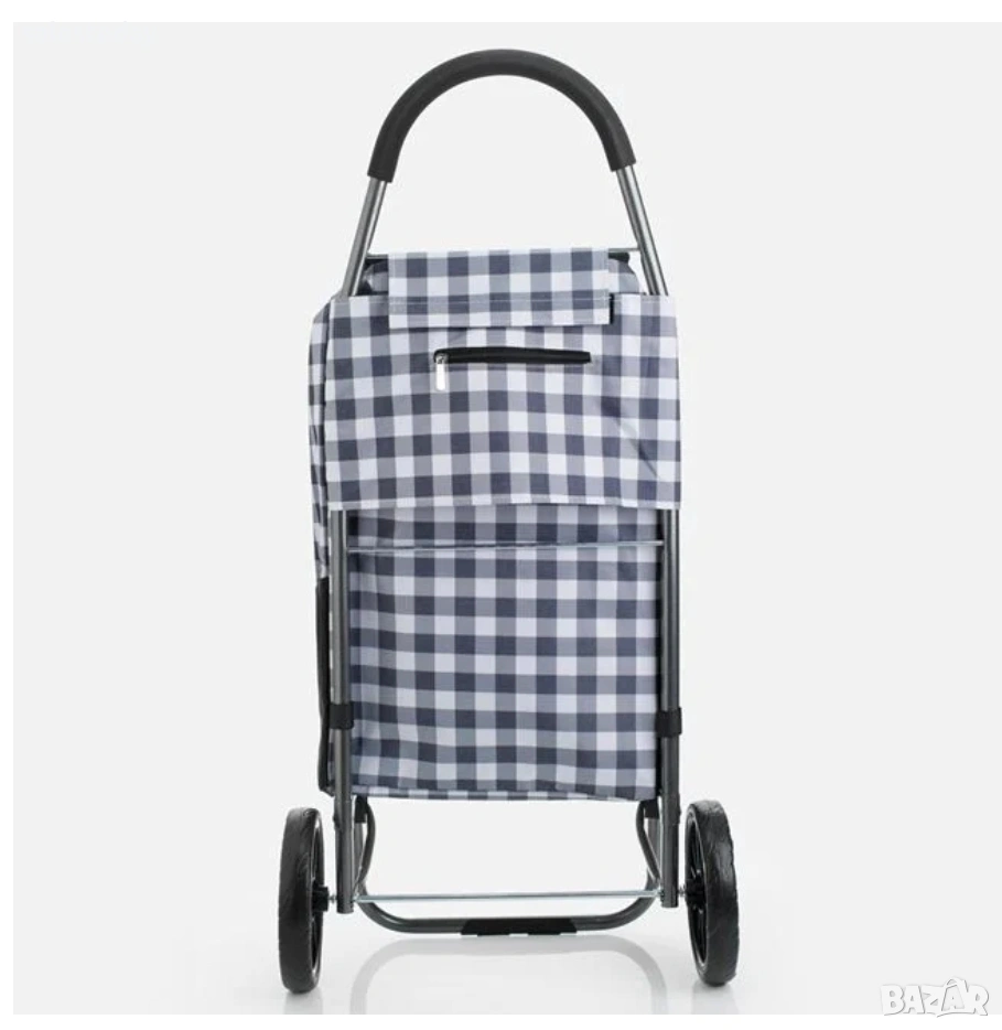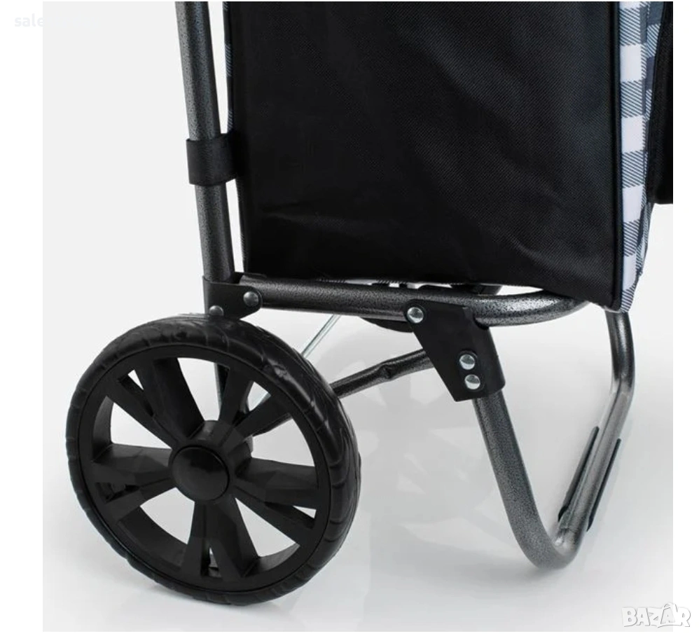 пазарска количка каре сивo бяло, за лесно пренасяне и съхранение на покупките. Изработена от полиестерен плат 600D със здрава конструкция, PVC подплата и метална рамка. Големите EVA колела я правят лесна за пренасяне. Затваря се с връзка и капак, а дръжката има мека подплата, за да не се плъзга и да не се поти ръката. Почиства се лесно с влажна кърпа.