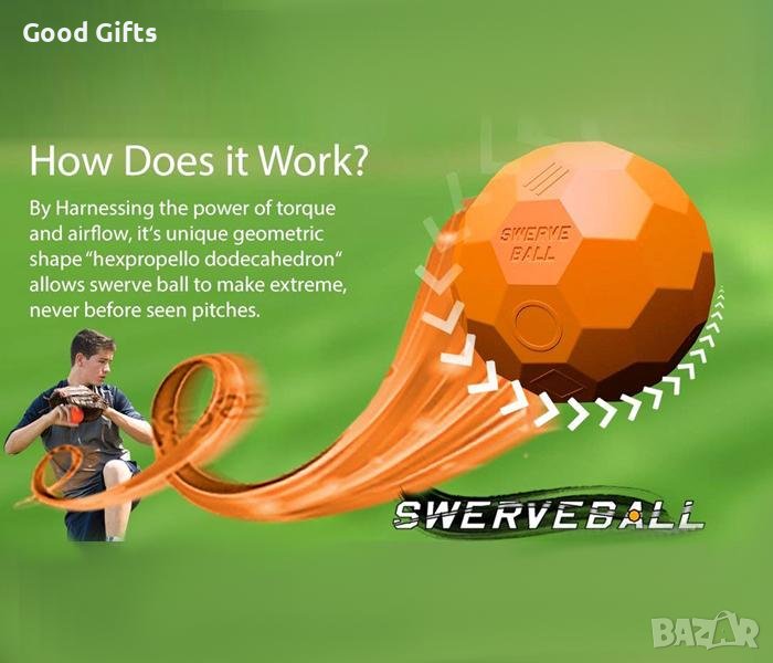 Swerve Ball е специално проектиран да улесни хвърлянето. Просто поставете пръстите си на посочените маркери за определен тип терен и хвърляйте! Swerve Ball ви позволява да хвърляте извити топки, потъващи топки, плъзгачи, бързи топки, топки с кокалчета и да променяте позиции само като регулирате задържането си върху нея. Възраст 6+.