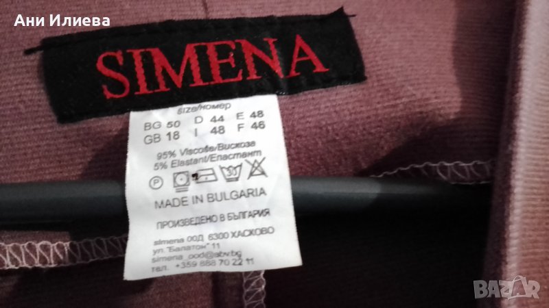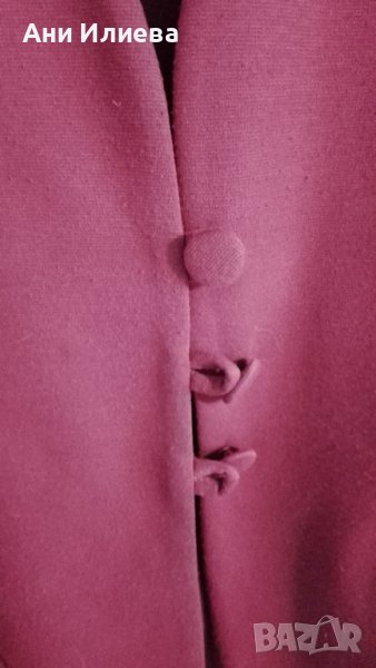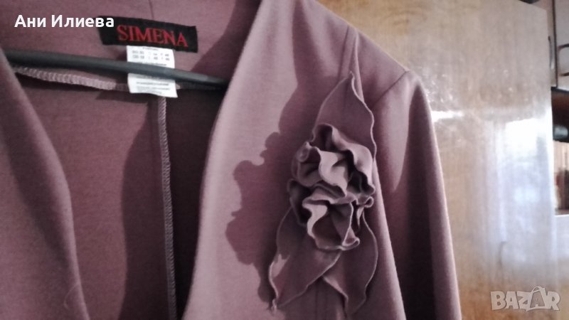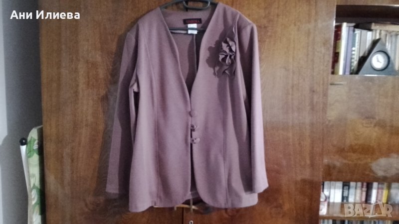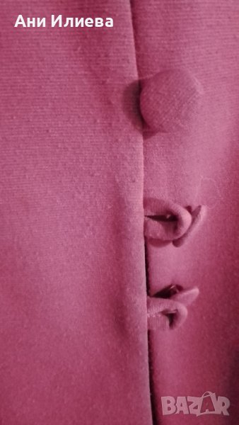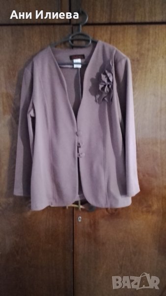 Спортно - елегантно, много красив и стилен цвят, по-тъмният вариант на пепел от рози. С пищно цвете от същия плат. Обличано е не повече от 3 пъти, но от търкането в другите дрехи на закачалките вероятно има леки топченица отпред до облечените в плат копчета. Илиците също са много интересни. България.