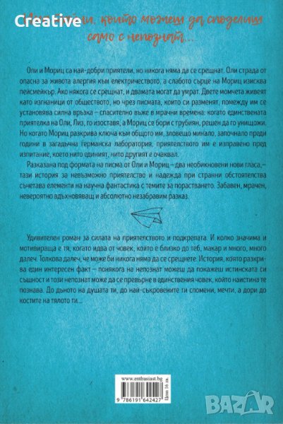 Разказана под формата на писма от Оли и Мориц - два необикновени нови гласа, - тази история за невъзможно приятелство и надежда при странни обстоятелства съчетава елементи на научна фантастика с темите за порастването. Забавен, мрачен, невероятно вдъхновяващ и абсолютно незабравим разказ.