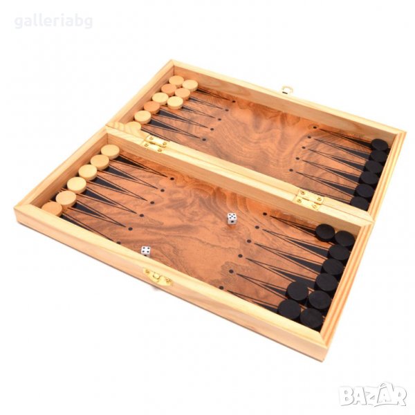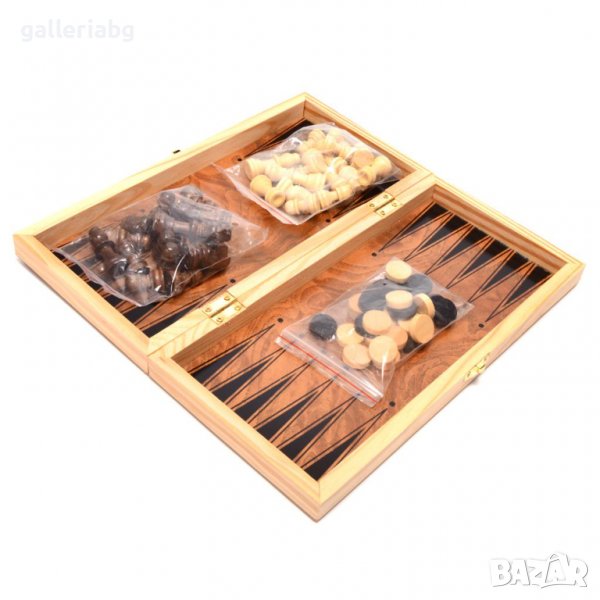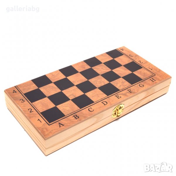 Комплект шах и табла в дървена кутия. Предлага се в картонена кутия.