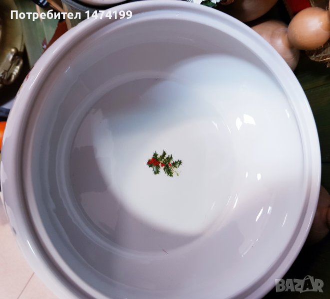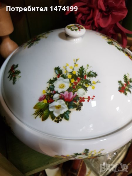 Голям супник Лиможки порцелан с много красив коледен дизайн. Маркиран. Забележката е отчупване по ръба от долната страна на капака и почти невидимо като черта напукване. Цената, разбира се, е съобразена.