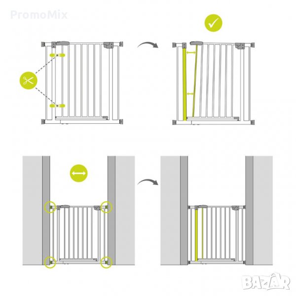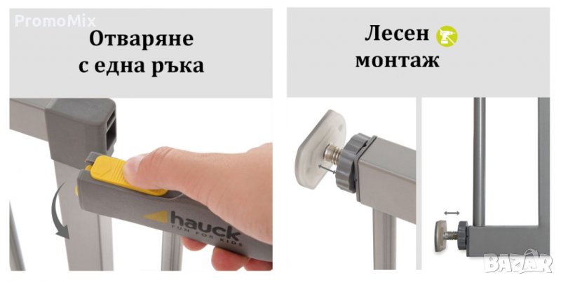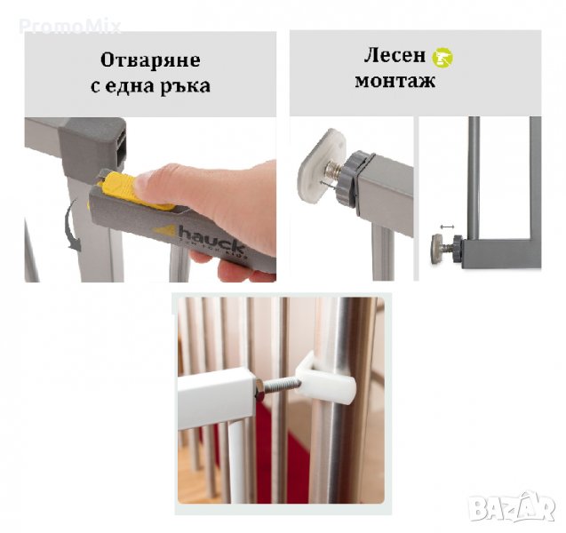 След като е правилно монтирана преградата, вратата може да се отваря и в двете посоки от родителя с една ръка, преодолявайки плъзгащия заключващ механизъм.