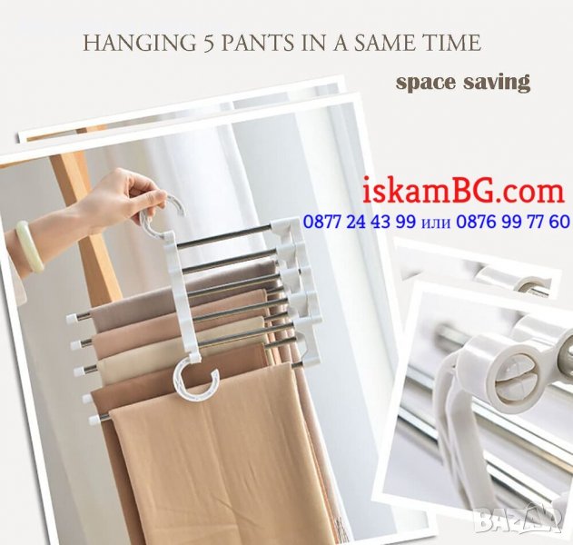 Закачалка за Панталони 5 в 1 е удобна за окачване на добре подредените панталони, заемаща минималното пространство в гардероба. Нейният универсален дизайн е проектиран така, че да може да се окачи на две различни позиции, в зависимост от нуждите на потребителя.Също така позволява да намерите и вземете панталоните с пълно удобство, тъй като опорните пръти са подвижни и могат да се плъзгат, за да се улесни вземането на облеклата. Лесен начин да организирате панталоните и да се възползвате от максималното пространство в гардероба.