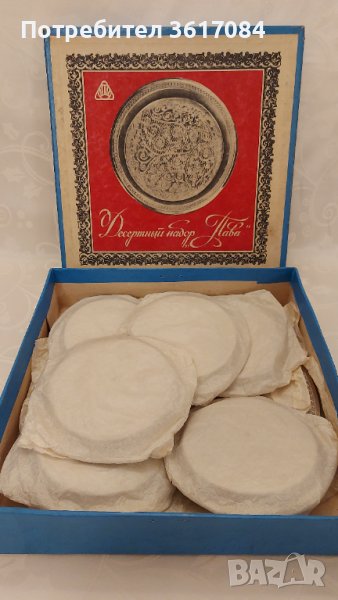Руски ретро сервиз за поднасяне на десерти "Пава" от седем части, голяма тортена чиния и 6 малки чинии. От 70-те години на миналия век, съхранява се още в оригиналната си кутия и с оригиналните си опаковки, така ще го получите и Вие. Има четлив печат на кутията за датата на производство. Използван е няколко пъти, състоянието му е почти като ново. Изработен е от неръждаема стомана, голямата чиния е с диаметър 34 см, а малките са 17 см. Сервизът може да се използва и по много други начини, като подноси, плата и декорация. Но не само голямата чиния, малките са много ценни за подложки под бутилка вино примерно. За подносчета на тоалетката, в които се съхраняват парфюми, пудри и други цапащи неща. За съхранение на бижута и т.н. На снимките има примери. Декорациите не са част от предложението и не се продават.