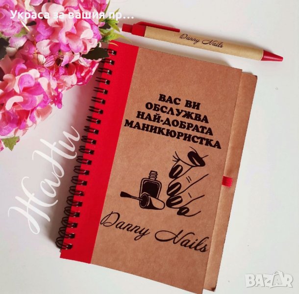 Подаръчен комплект за Маникюристка 💅 💅Престилка 💅Гравиран тефтер +гравиран химикал с име → Обява 39385104