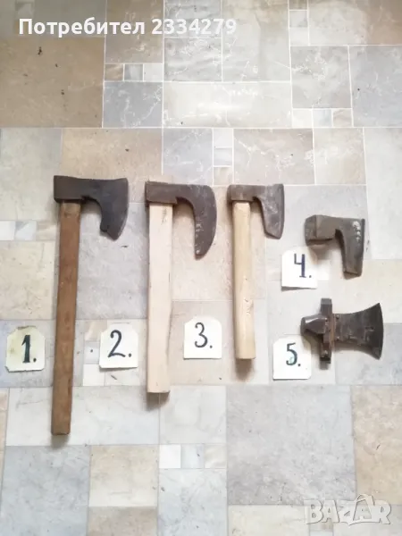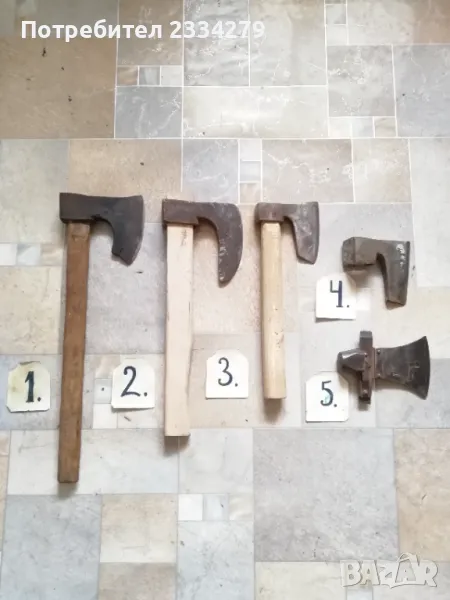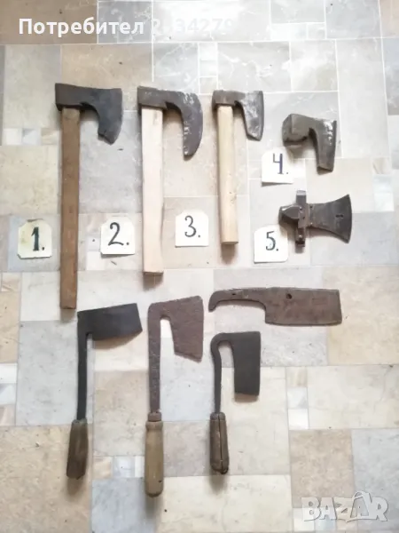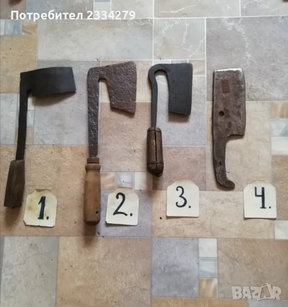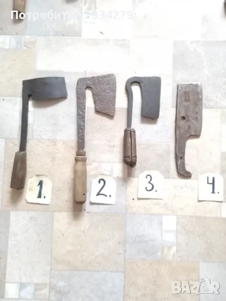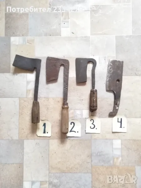 Брадвички N:1, N:2, N:3 по 15лв. Без сап 10лв. Сатъри: N:1 рукан, нож за обрязване на копита, цена 20лв.; N:2, 3 стари сатъри от турски времена, цена 17лв. брой;