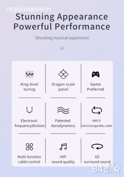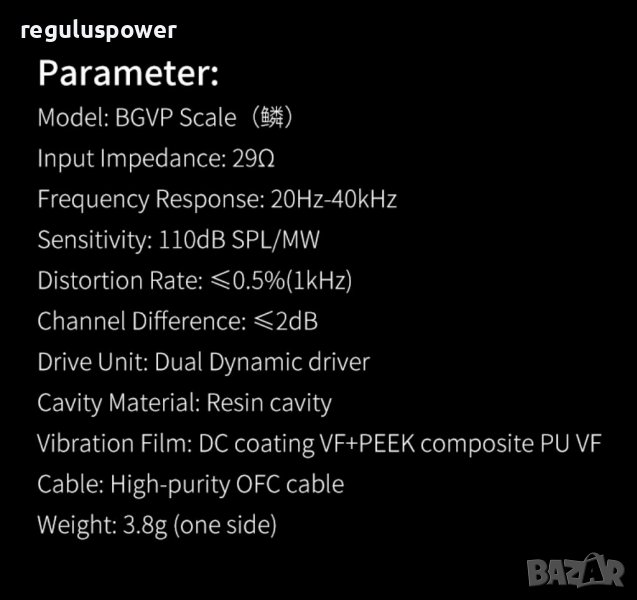 BGVP Scale са сертифицирани Hi-res монитори за поставяне в уши с двоен динамичен драйвер и висока разделителна способност, които осигуряват впечатляващо аудио. Те разполагат с 10 mm и 6 mm динамичен драйвер във всяка слушалка, осигурявайки качествено представяне. Двойката може да се похвали със зашеметяващ външен вид със своите дизайнерски лицеви панели с драконови люспи. BGVP Scale ви предлага автентично аудио изживяване!!!